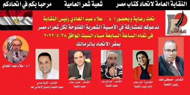 تنظم شعبة شعر العامية بالنقابة العامة لاتحاد كتاب مصر برئاسة دكتور علاء عبدالهادي، أمسية شعرية مفتوحة لكل شعراء مصر، وذلك في السابعة مساء السبت 28 مايو الجاري، بمقر اتحاد الكتاب بالزمالك. يعد الأمسية كل من الشاعر مصطفى مقلد، رئيس الشعبة، والشاعرة أمل عامر، نائب رئيس الشعبة، والأعضاء الشاعر أبوالخير بدر، …