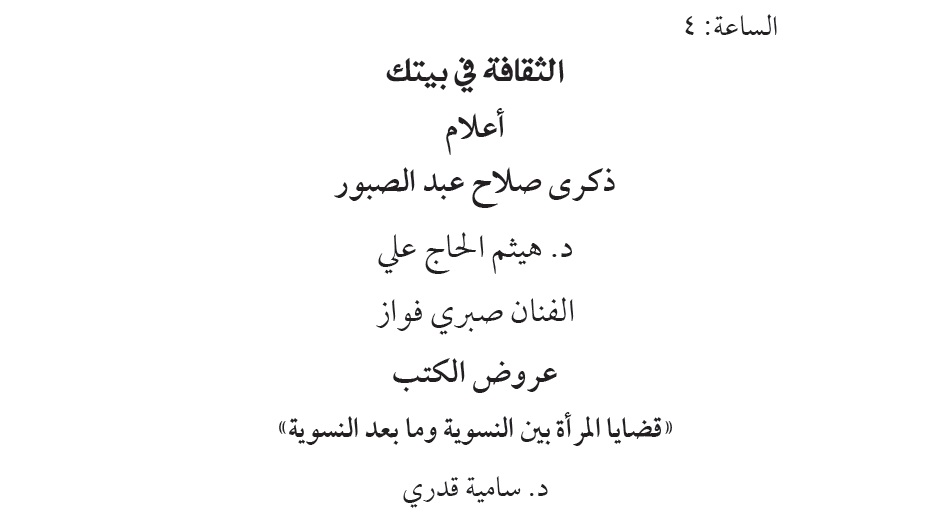 محور الثقافة في بيتك ضمن فعاليات معرض الكتاب في دورته الـ52 على المنصة الإلكترونية للمعرض ويتضمن أعلام الثقافة وعروض الكتب وعرضا موسيقيا