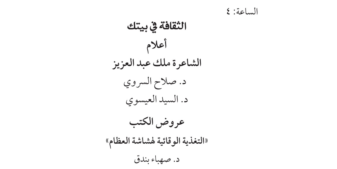 محور الثقافة في بيتك ضمن فعاليات معرض الكتاب في دورته الـ52 على المنصة الإلكترونية للمعرض ويتضمن أعلام الثقافة وعروض الكتب وعرضا موسيقيا