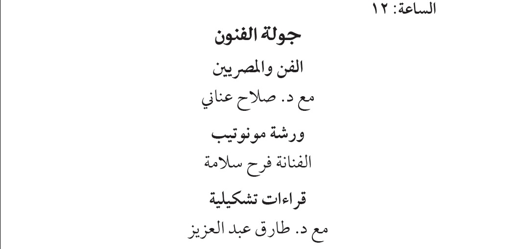 محور جولة الفنون ضمن فعاليات معرض الكتاب في دورته الـ52 على المنصة الإلكترونية للمعرض ويتضمن برنامج الفن والمصريين وورشة لتعليم التشكيل بقشر الخشب وقراءات تشكيلية
