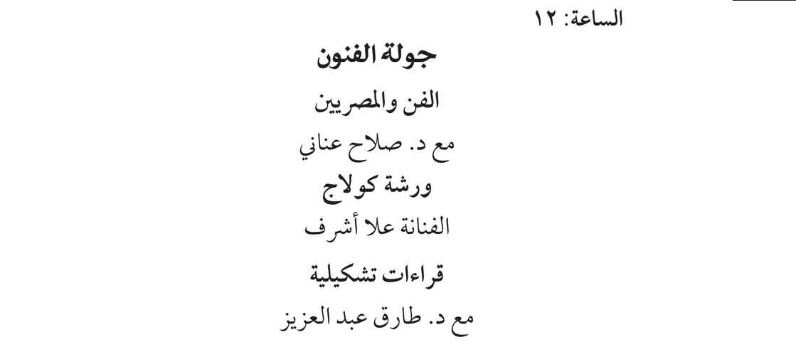 محور جولة الفنون ضمن فعاليات معرض الكتاب في دورته الـ52 على المنصة الإلكترونية للمعرض ويتضمن برنامج الفن والمصريين وورشة لتعليم الكولاج وقراءات تشكيلية.