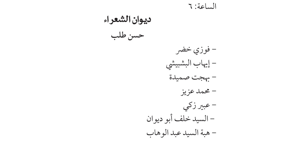 الصفحة الرئيسية الفعاليات ديوان الشعراء ديوان الشعراء تتوفر الفعاليات بمجرد بثها على المنصة الإلكترونية للمعرض حسن طلب فوزي خضر إيهاب البشبيشي بهجت صميدة محمد عزيز عبير زكي السيد خلف أبو ديوان هبة السيد عبد الوهاب Tags: أدب, أطفال, الموقع الصحفي للمعرض, ديوان الشعراء, ذاكرة المعرض, سليم حسن, سينما, سينما تياترو, شعر, فعاليات المعرض, فنون تشكيلية, مسرح, معرض القاهرة الدولي للكتاب 52, ملتقى الكتب, موسوعة مصر القديمة, وزارة الثقافة التاريخ يوليو 06 2021 انتهى! يمكن مشاهدة البث كاملا الآن.. الوقت 6:00 pm - 8:00 pm الأقسام فعاليات شارك هذا الحدث