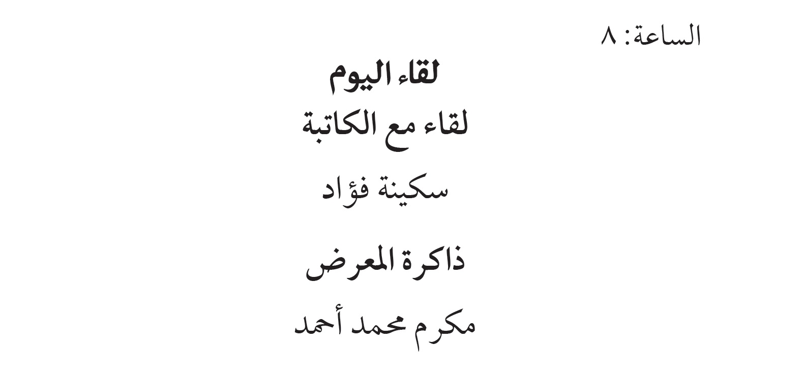محور لقاء اليوم ضمن فعاليات معرض الكتاب في دورته الـ52 على المنصة الإلكترونية للمعرض ويتضمن لقاء مع الكاتبة سكينة فؤاد وذاكرة المعرض مع مكرم محمد أحمد