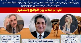 تنظم شعبة أدب الرحلات برئاسة الشاعرة فاتن متولى برعاية الدكتور علاء عبد الهادى رئيس اتحاد كتاب مصر، ندوة في السادسة من مساء غد الأحد بعنوان “أدب الرحلات بين الواقع والمتخيل”. يتحدث خلال الندوة الأستاذ الدكتور والمفكر والروائي طارق منصور، بحضور عدد كبير من النقاد والصحفيين وجمهور الأدب.