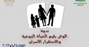 تحت رعاية الدكتورة إيناس عبد الدايم وزيرة الثقافة؛ يقيم المجلس الأعلى للثقافة بأمانة الدكتور هشام عزمي، ندوة “الوعى بقيم الحياه الزوجية والاستقرار الأسرى “؛ والتى تنظمها لجنة الفلسفة وعلم الاجتماع والانثربولوجيا ومقررها الدكتور أحمد مجدي حجازى، وذلك في تمام الثانية عشرة ظهرًا يوم الثلاثاء 24 مايو الحالى بقاعة الندوات بالمجلس …