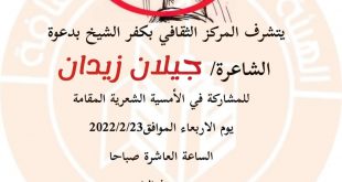 يقيم المركز الثقافي بكفر الشيخ ندوة، تحت عنوان “دور الأسرة في الحد من ظاهرة العنف المجتمعي”، وذلك في العاشرة صباح يوم الأربعاء المقبل، 23 فبراير. يلي الندوة أمسية شعرية وورشة فنية، وتشارك في الأمسية الشعرية، الشاعرة جيلان زيدان، حيث تلقي بعضا من أشعارها، التي تنتمي لقصائد النثر.