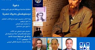 تنظم الجمعية المصرية لخريجي الجامعات الروسية والسوفيتية احتفالية بعنوان ” دوستويفسكي بحروف مصرية ” بمناسبة مرور 200 عام على ذكرى ميلاده، وذلك فى السابعة مساء غد الأحد 19 ديسمبر الجاري بقاعة الندوات بالمركز الثقافى الروسي بالدقى. الاحتفالية تشهد طرح رؤية 3 كتاب مصريين حول إبداع دوستويفسكى الذى يعد من أعظم …