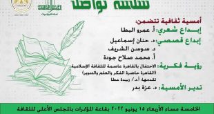 تحت رعاية إيناس عبد الدايم وزيرة الثقافة؛ والدكتور هشام عزمي الأمين العام للمجلس الأعلى للثقافة؛ تنظم لجنة السرد القصصي والروائي بالمجلس ومقررها الكتور حسين حمودة؛ أمسية ثقافية ضمن فعاليات سلسلة “تواصل” التي تنظمها اللجنة تحت إشراف الدكتورة عزة بدر عضوة اللجنة، وتبدأ الأمسية في تمام الخامسة من مساء الأربعاء 16 …