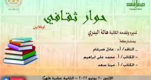 يقيم المجلس الأعلى للثقافة بأمانة الدكتور هشام عزمي، الحوار الثقافي الذي تديره الروائية الكبيرة هالة البدري عضوة اللجنة؛ وتحاور خلاله الناقدة الكبيرة رزان إبراهيم، والكاتب الكبير واسينى الاعرج، ويبدأ الحوار في تمام الثانية عشرة ظهرًا يوم الإثنين ١٥مايو الحالي، ويعقد أونلاين عبر تطبيق زووم؛ ويمكن لمن يرغب المشاركة أونلاين بالحوار …