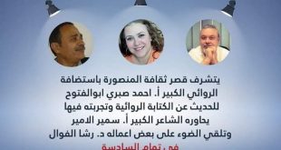 يستضيف نادي أدب قصر ثقافة المنصورة ليلة إبداعية مختلفة وذلك بإقامة ندوة للحديث عن تجربة الكاتب الكبير أحمد صبري أبو الفتوح. يتحدث الكاتب أحمد صبري أبوالفتوح عن تجربته الإبداعية، ويناقشه الكاتب الكبير سمير الأمير. كما تتقدم الشاعرة الدكتورة رشا الفوال بقراءة نقدية في بعض أعماله. تقام الندوة في تمام السادسة …