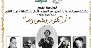 تقام بمكتبة مصر العامة بالمنصورة بالتعاون مع المجلس الاعلى للثقافة، لجنة الشعر، أمسية شعرية ونقدية، بعنوان ” أم كلثوم وشعراؤها”، تديرها الشاعرة الدكتورة رشا الفوال. وذلك في الرابعة عصر غد الأربعاء. يشارك في الأمسية من النقاد الدكتور أحمد الزلوعي يقدم ورقة بحثية بعنوان (أم كلثوم وطاهر أبو فاشا). و رامي هلال …